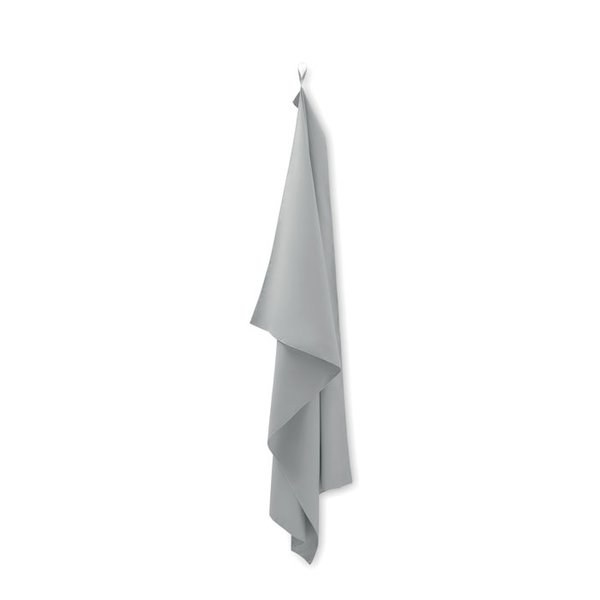 Microfibre towel made of 90% polyester and 10% polyamide with elastic hanger loop.