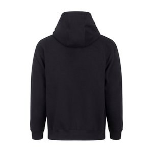 Three-panel hood without drawstring. Brushed interior. 100% cotton outer surface for better structure. Ribbed cuffs and hem. Full-length YKK zipper closure.