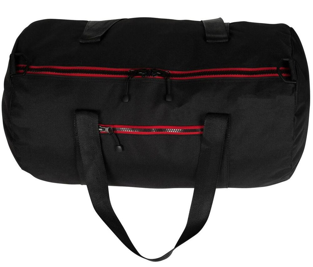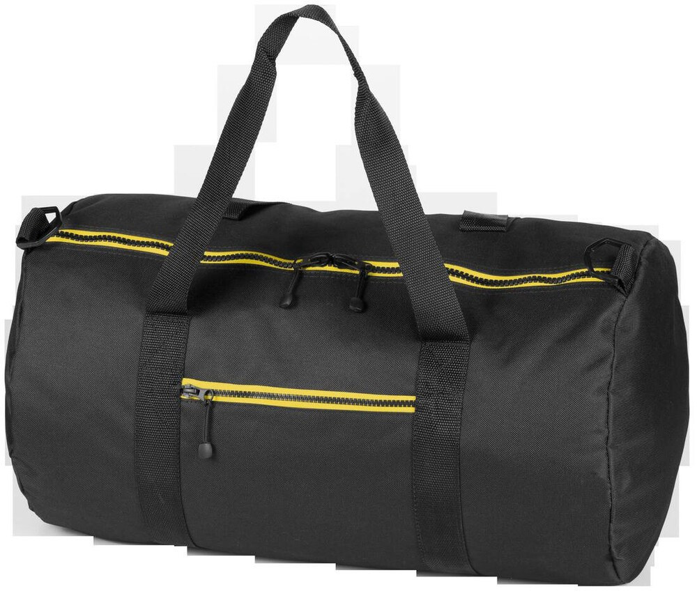 100% polyester. Short trips or sport activities bag. Tubular shape. Main compartment and front zipped pocket with contrast zips. Handles. Removable reinforced shoulder strap. Front print area: 12x12 cm. Side print area: 14 x14 cm.
