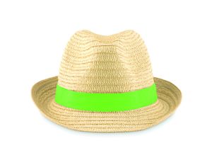 Paper straw hat with coloured polyester band.