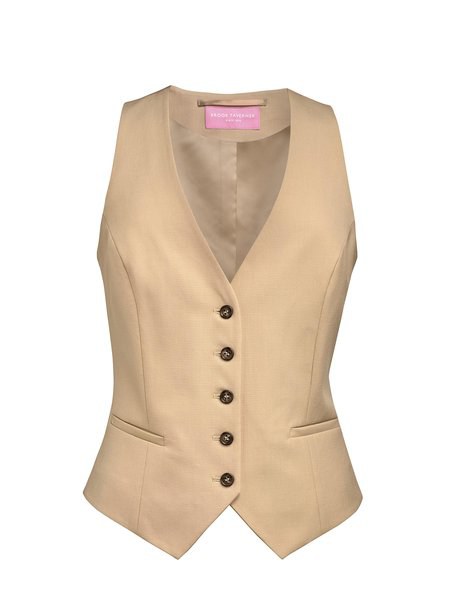 Fitted cut, 5-button front, lined back with adjustment, 2 narrow pockets with piping.