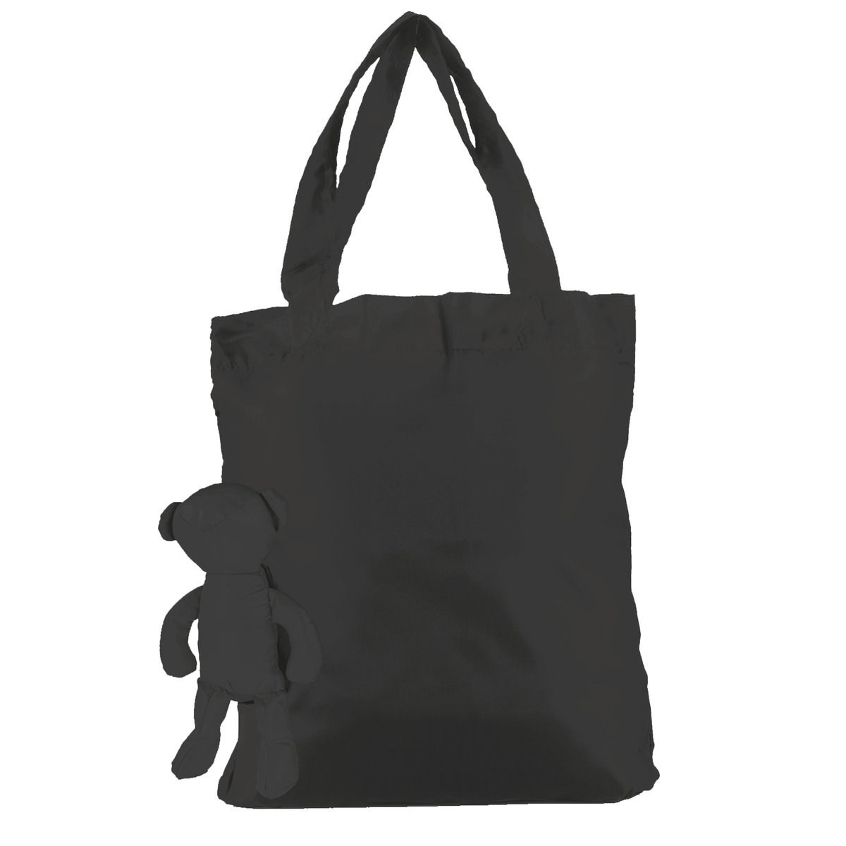Foldable shopping bag with open main compartment, short reinforced handles, foldable in a bear shape with zipper closure.