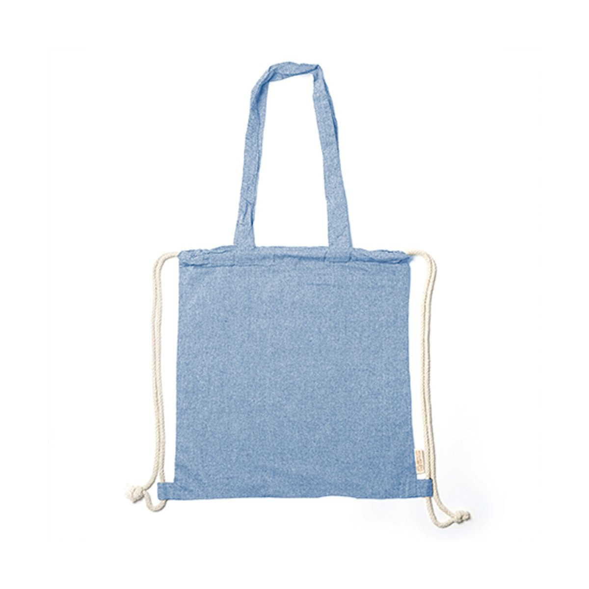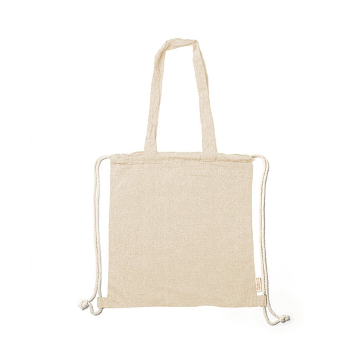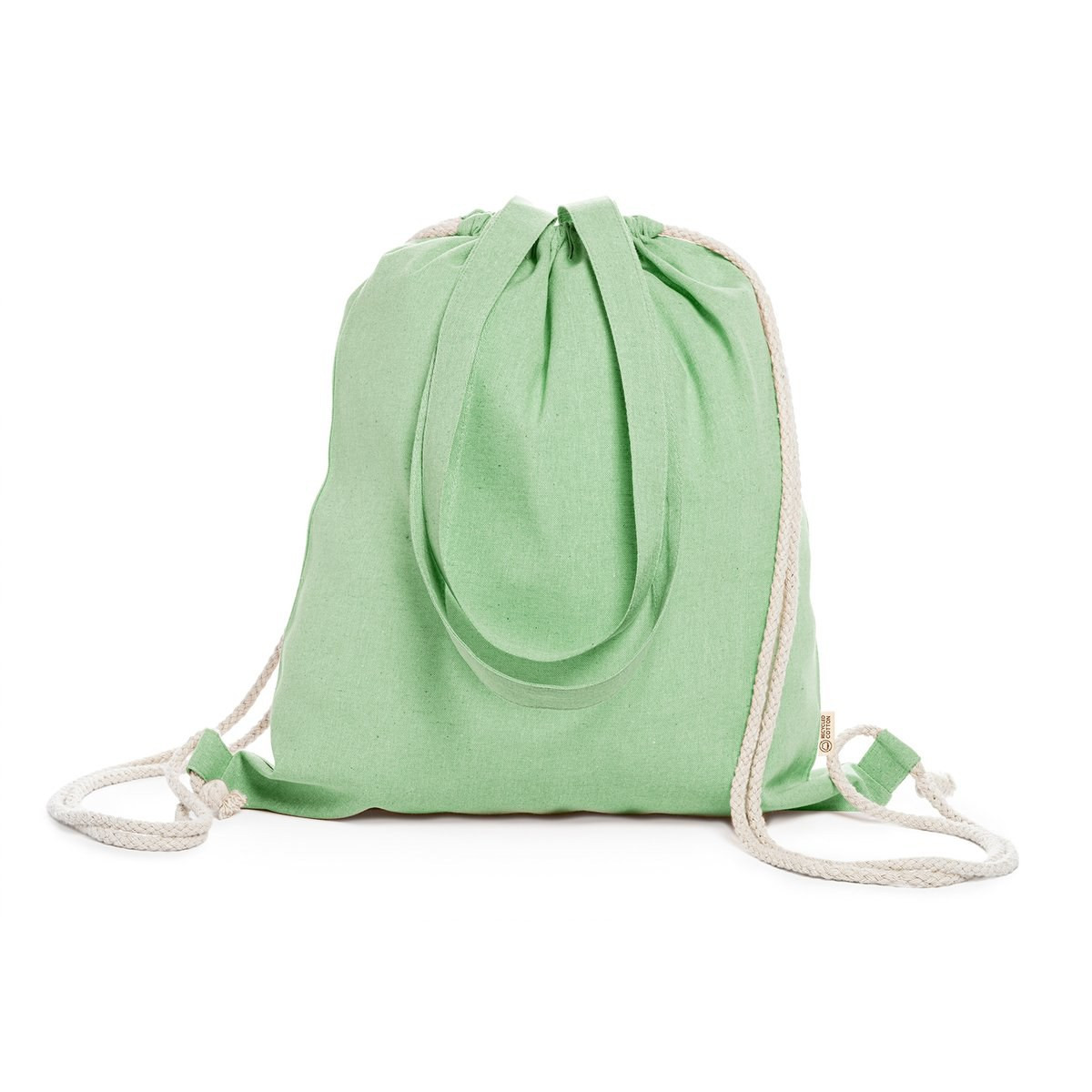 Shopping bag/drawstring backpack, made of strong, 140g/m2 recycled cotton, with matching, 70cm, carry handles. Strings in natural cotton and recycled cotton distinctive in the label. Available in a wide range of colours.