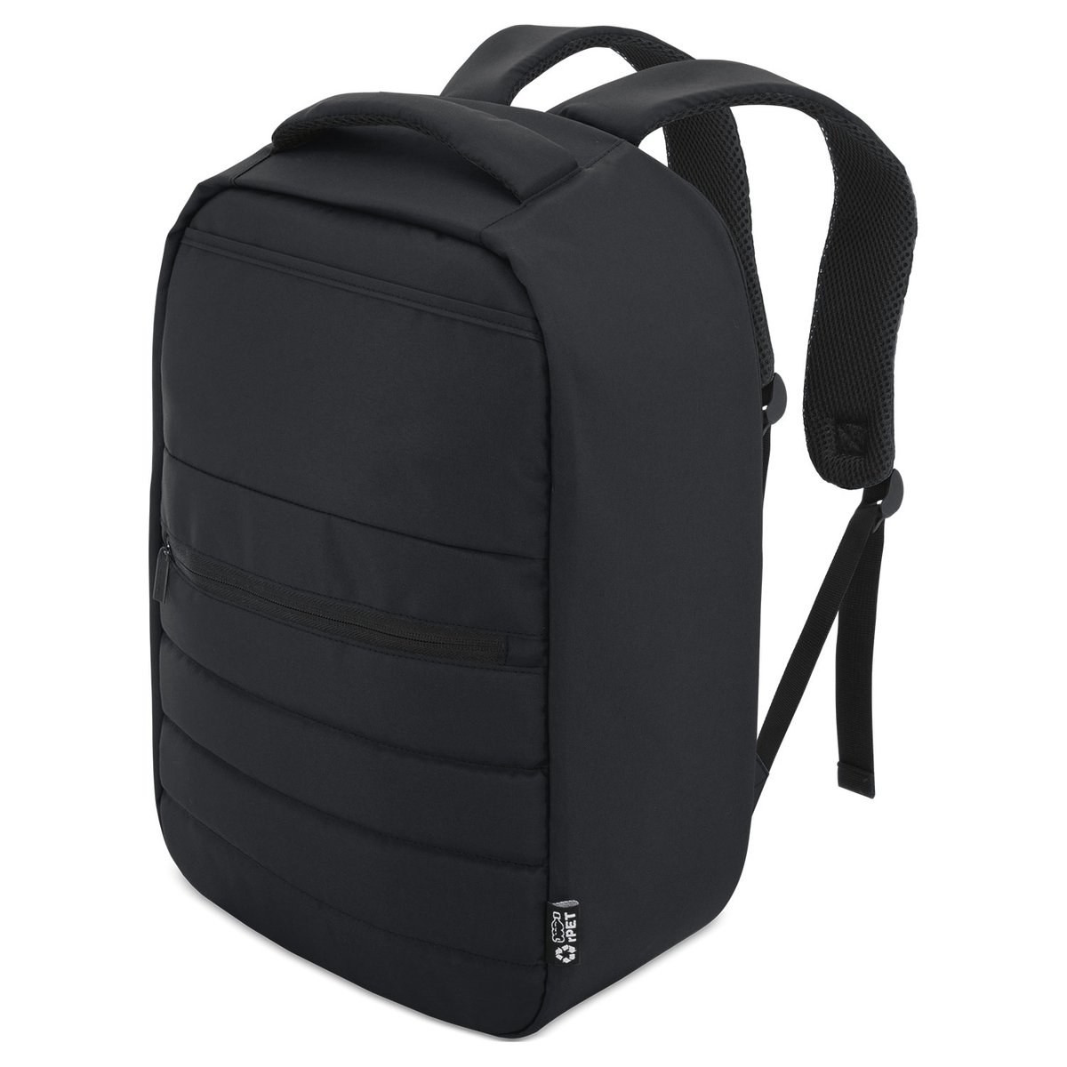Laptop backpack in RPET, with internal padded compartment suitable for laptops measuring up to 17". Anti-theft pocket on the back with zip closure. Adjustable padded shoulder straps. Padded back. Possibility to open it to 180°. Elastic band to hook it to the trolley.