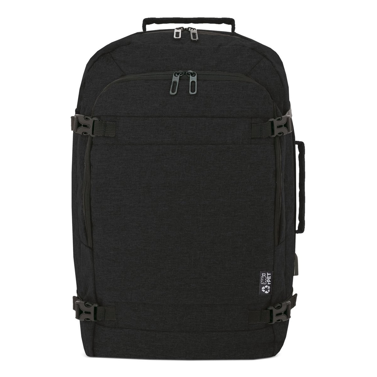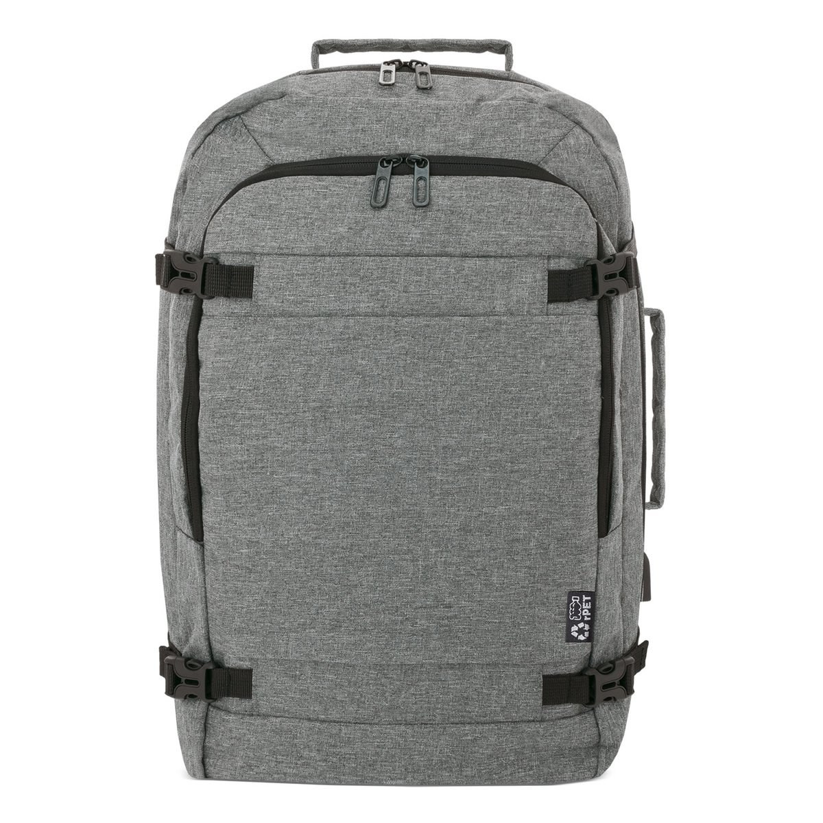 Travel backpack made of RPET, two main compartments with zip closure, internal computer pocket, and several internal pockets. Front zip pocket. Adjustable side buckles. Anti-theft pocket on the back. USB port. Convenient carrying handle. Trolley strap. Adjustable shoulder straps.