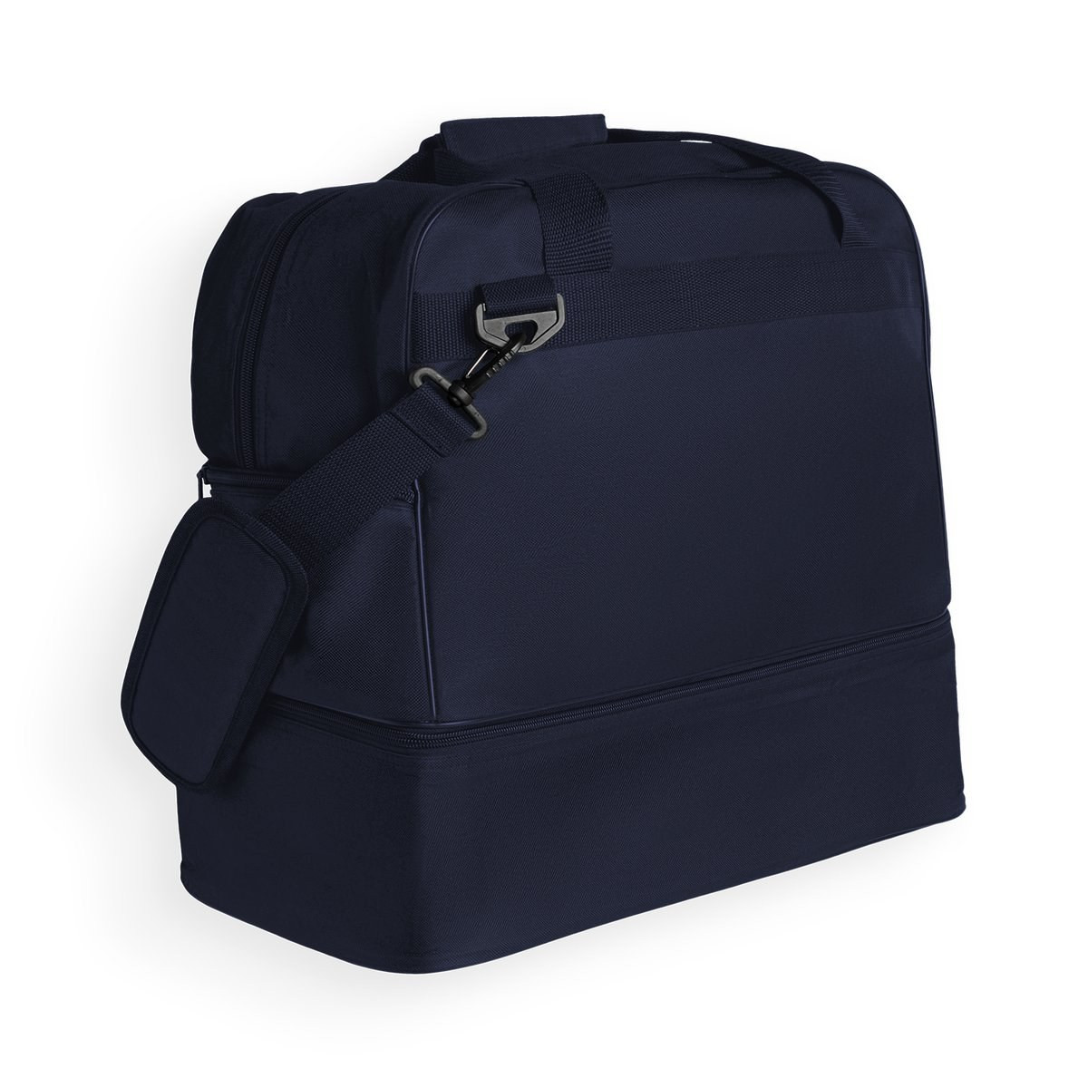 Sports bag with large main compartment with zipper. Lower shoe compartment. Reinforced top handles. Adjustable shoulder strap. Small zippered side pocket. Coordinated colored zippers.