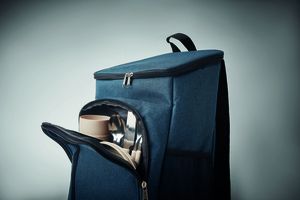 Cooler bag or outdoor picnic backpack in 2 tone 600D RPET including 2person table accessories.