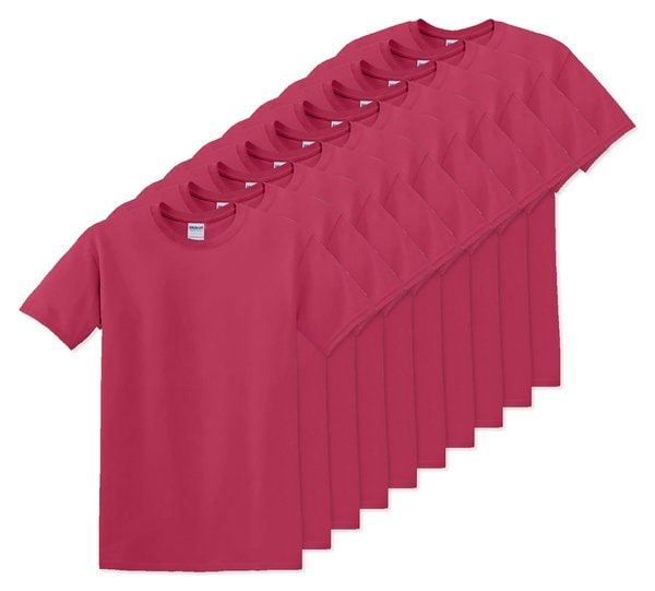 -Sunset, Safety Pink, Russet, Neon (Green, Blue), Midnight, Lilac, Blackberry, Tweed, Safety Green, S. Orange, Dark Heather, Graphite Heather, and Heather (Military Green, Radiant Orchid, Red, Sapphire) are 50% cotton, 50% polyester