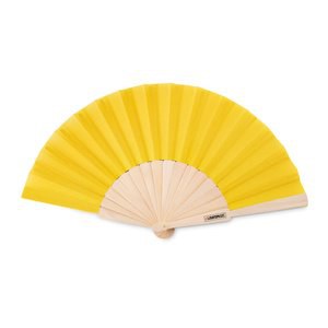 Manual hand fan in wood with polyester fabric.