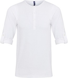 This t-shirt has a round neck with a 3-button opening , it can be worn long- sleeved or rolled up thanks to its button placket on the sleeves .