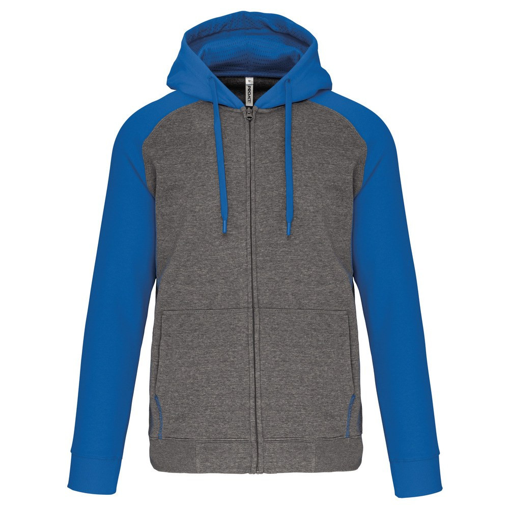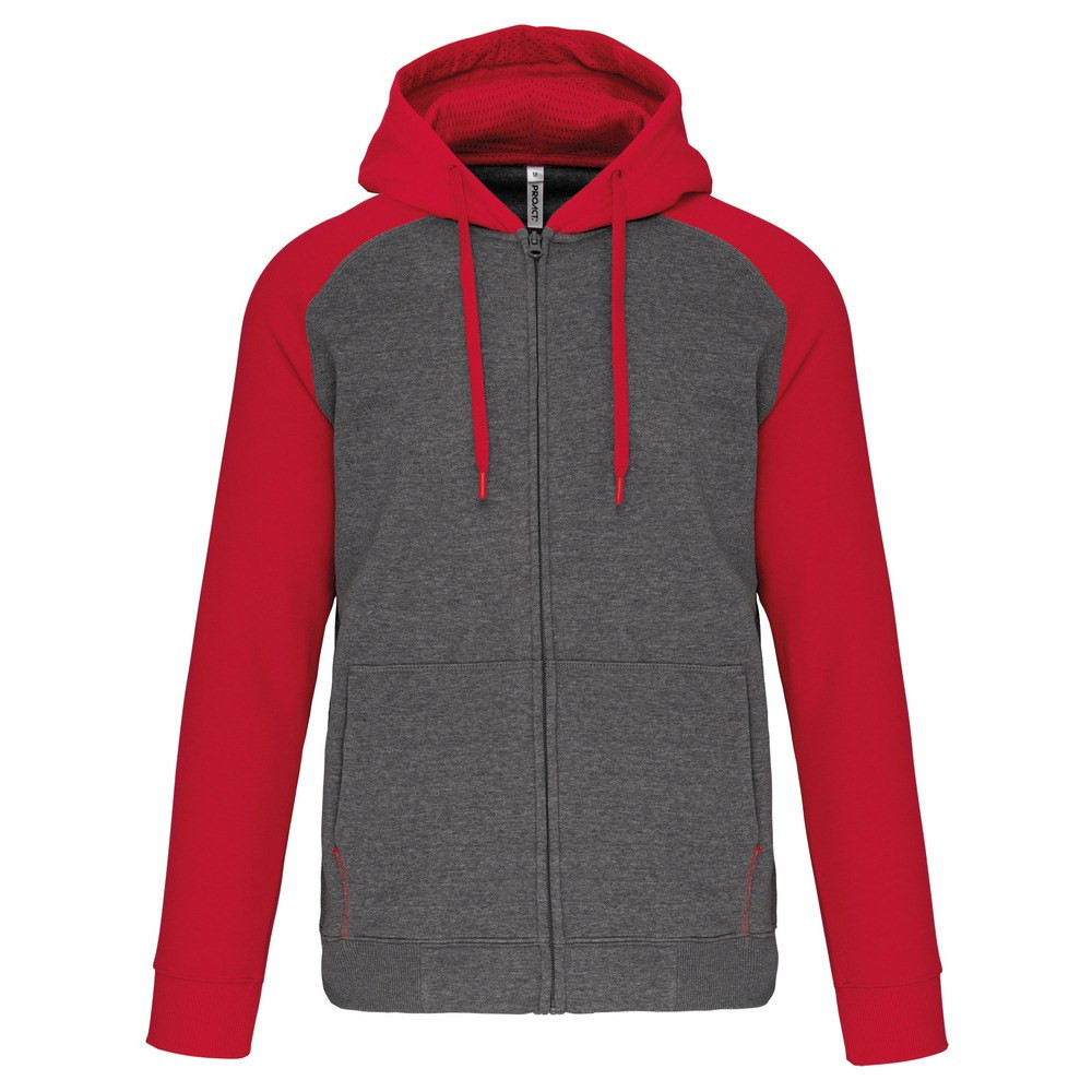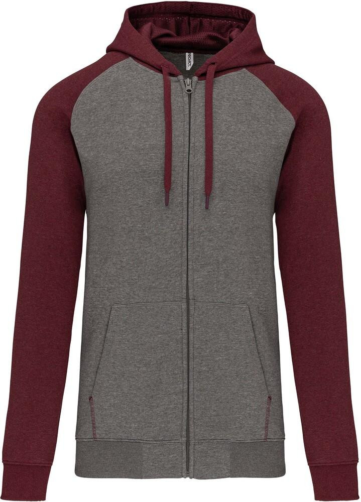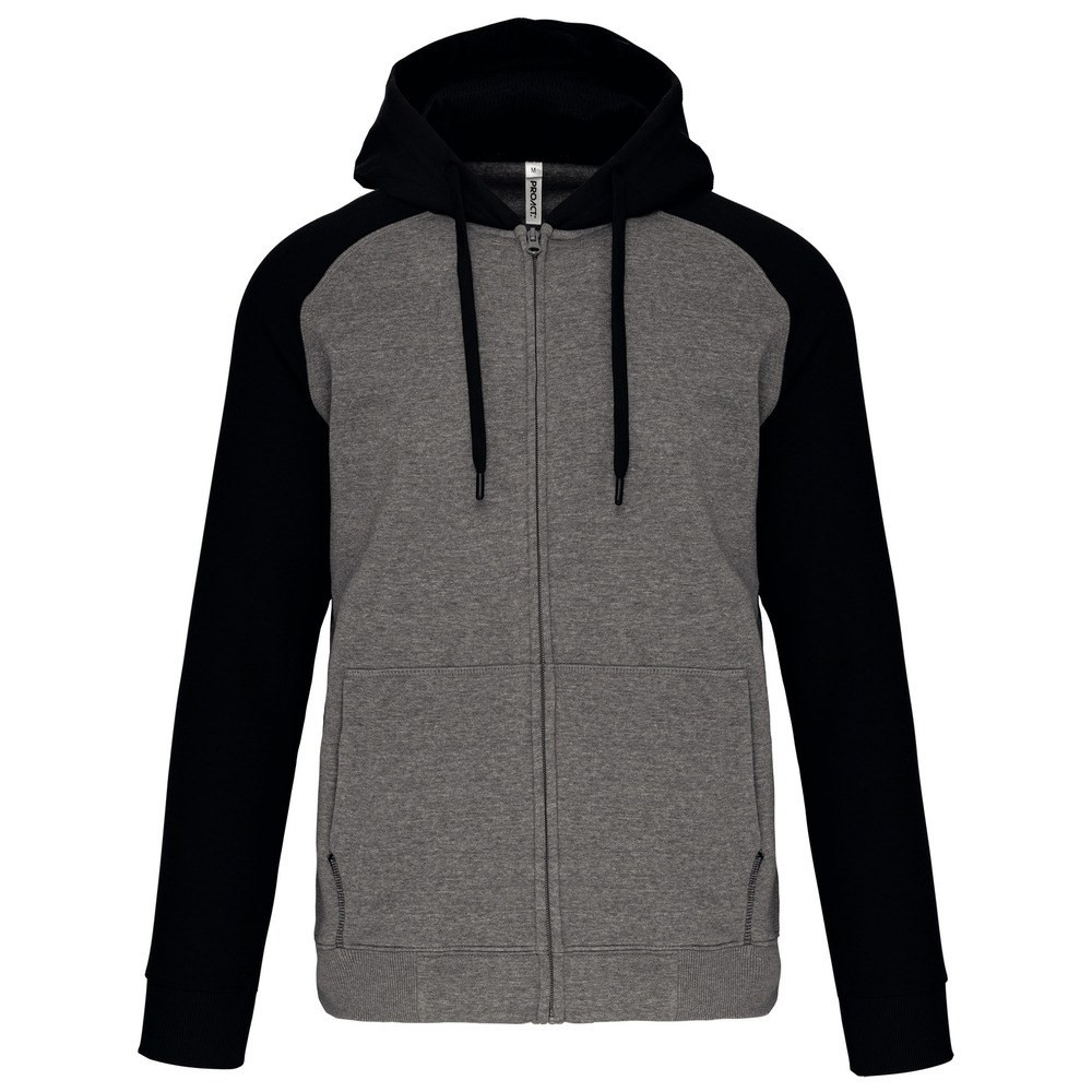 Contrasting raglan sleeves and hood.