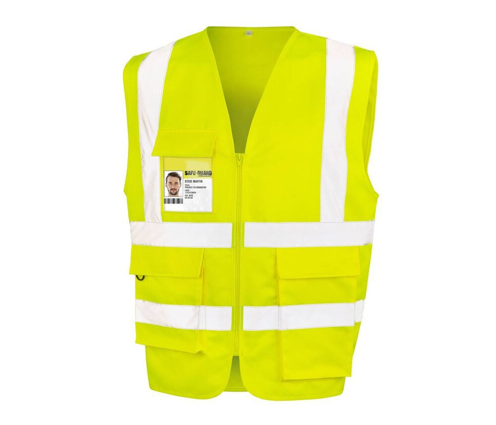 5cm reflective stripes on body and shoulders. Large logo area on chest and shoulders. Deep pocket for control devices. Side pockets of different depths with hook and loop closure. Chest pocket with access badge pocket. Zipper front closure. Loose fit. D-ring closure. Hanging tab. EN ISO 2013+A1 :2016 Class 2 certified.