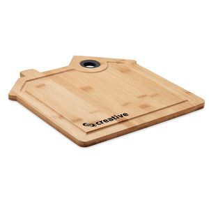 House shaped cutting board in bamboo with groove and hanging hole.