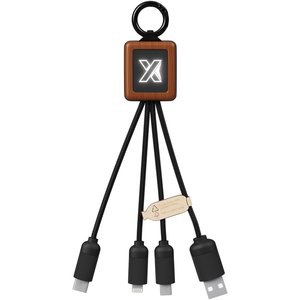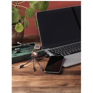 3-in-1 20W wooden cable with light-up logo and 3 connectors (Type-C/micro USB/iPhone), and cords made of Recycled PET plastic. The cable can charge up to 3 devices at the same time. Patent EUROPE EUIPO.