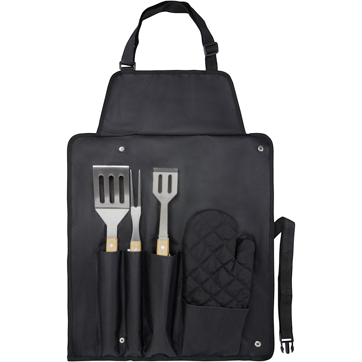 5-piece BBQ set with a shovel (36.5 x 7 cm), fork (36.5 x 2 cm), tong (36.5 x 5 cm), glove (25 x 16 cm), and an apron including pouch (42 x 60 cm). The handles are made of bamboo that is sourced and produced following sustainable standards.