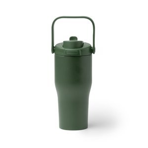 Features a screw lid with an automatic dual opening dispenser operated by a push button, incorporating a foldable straw.