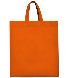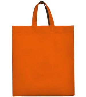 Heat-sealed bag with gusset on the sides and base, and matching short handles, made of non-woven fabric.