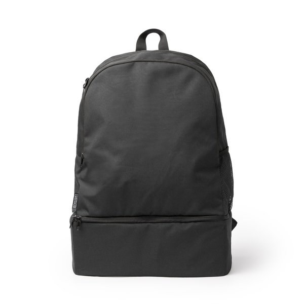 It has a side pocket in mesh fabric with elastic adjustment for carrying bottles At the bottom, it includes a rigid shoe compartment that allows belongings to be separated from the rest of the backpack.