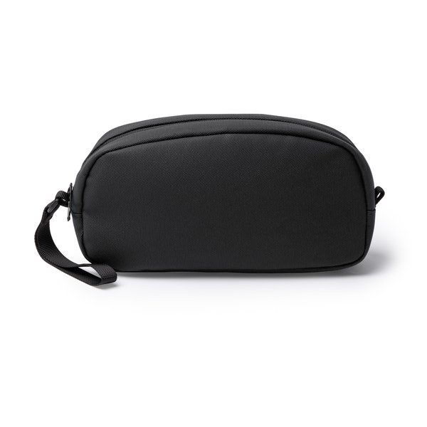 Toiletry bag made from PU leather with zip closure with handle.
